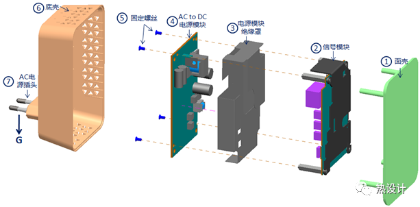 从图四 插墙网络设备的主要组成部件图可以看出,设备的内部堆叠方式常采用信号模块与电源模块组合的双板结构。由于两板间的空间有限,热量多集中在信号板与电源板之间难以散出。