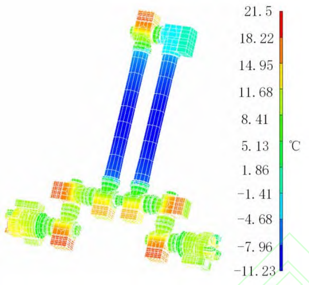 通过计算机数值模拟进行热仿真,可无实物对热设计进行模拟验证 ,并根据图像化界面能对整体温度分布有直观清晰的把握。如图 7 为空间机械臂的热仿真分析图像,能够为热试验做先期指导,再结合热试验验证热设计的合理性。
